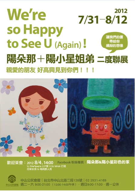 挟日本當代藝術大師村上隆於GEISAI TAIWAN # 1的「最佳人氣獎第二名」和奈良美智的鼓勵和肯定下,高人氣藝術創作姐弟組合-陽朵那〈Donna Yang〉和陽小星〈Hsin Yang〉二度舉辦名為「We’re so Happy to See U (Again)! 親愛的朋友 好高興見到你們!!!」的聯展,並確定於7/31【二】起於台北市中山公民會館舉行,透過繪畫展現他們源源不斷的愛、友情與正面能量。繼去年首度聯展大獲好評後,陽朵那和陽小星的作品受到許多藝術相關的單位青睞,包括:由中華電信和聯合報共同成立的「中華電智趣王FUN PARK」將他們繪本故事「老伯伯老婆婆搬石頭」以及「野人兄弟」數位化為線上閱讀的電子童書,讓愛與友情無限延伸;此外,陽朵那和陽小星受邀參加了由台北市藝術統合教育研究會所舉辦的「緣動動源The Re-source Project」活動,與各領域優秀的藝術創作者共同為台灣的藝術圈貢獻一份心力。承襲去年開幕茶會的感動與無限創意,今年的二度聯展的開幕茶會,除了以更繽紛活潑的色系呈獻專屬於陽朵那跟陽小星的彩色世界之外,更特別邀約活躍於藝術、影像、設計領域的創作者Rita*purple 22*紫和知名DJ Mitch以今年畫作中的人物為主角,特別為今年展覽量身打造的花草系甜美和時尚野人風VJ秀,並於開幕茶會當天首度呈現,勢必成為今年陽朵那和陽小星二度聯展中最不能錯過的視覺饗宴之一。