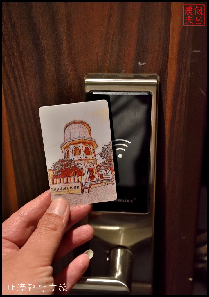 房門要憑房卡用電子感應才能打開,房卡上的圖案是現在是北港遊客服務中心的1930年昭和五年建造完成的水道頭十角水塔,非常有特色