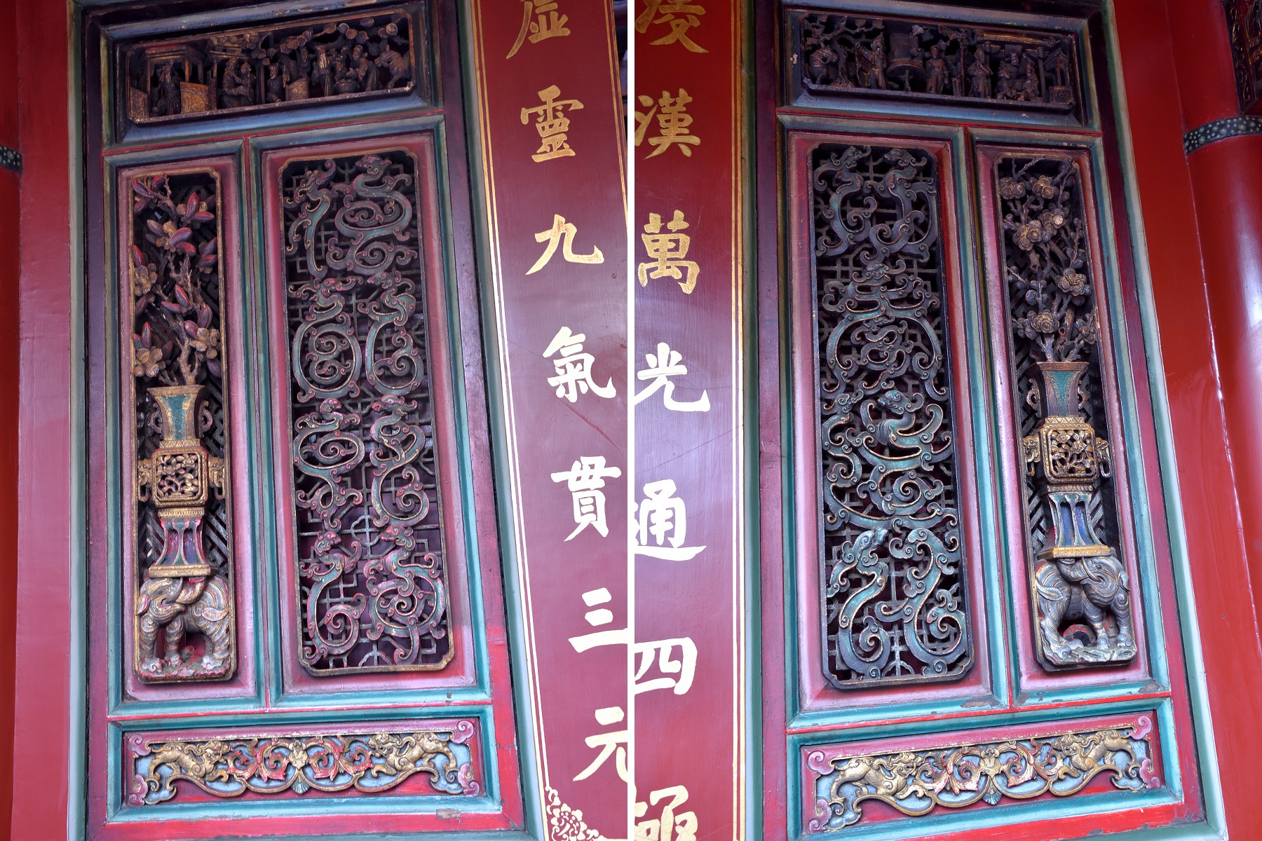 凌虛殿中門左右兩旁二旁格扇窗上分別為「功參造化」與「德配乾坤」,每個字均由二隻螭虎所組成,雌雄成雙,意味著陰陽相輔相成之道。