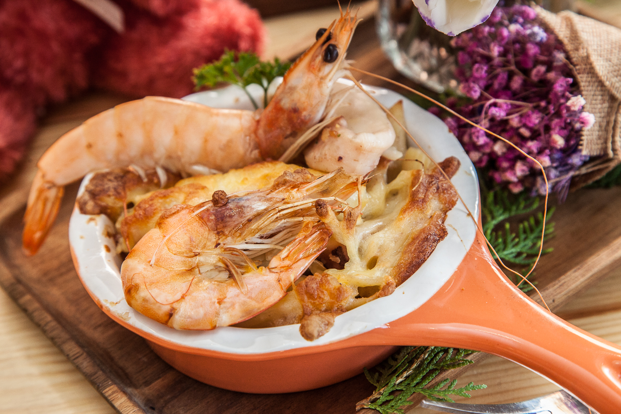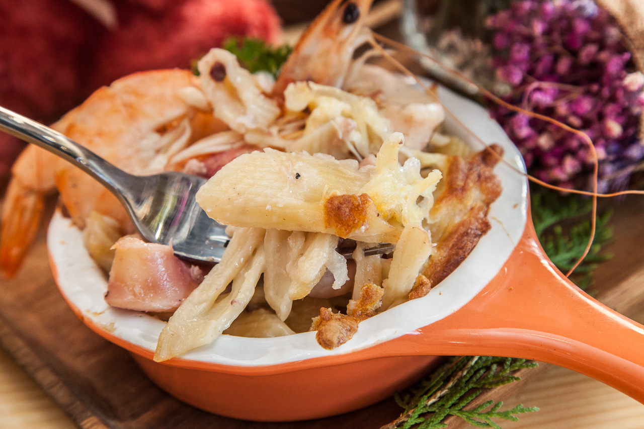 下面的通心粉吸收了海鮮鮮味,加上烘烤過濃稠的起司及荷蘭醬,口感濃郁鮮甜,一口海鮮一口面吃飽又吃巧