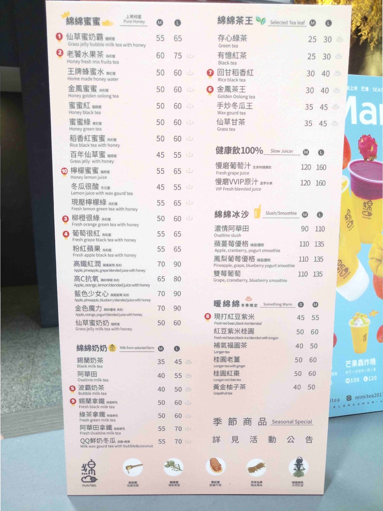 先來看菜單的部分,綿綿mimitea使用的基本原料有烏桕蜜、龍眼蜜、貴妃蜜這三種不同風味的蜂蜜,各自搭配不同種類的飲品,還使用了百年仙草和綠盈鮮乳。