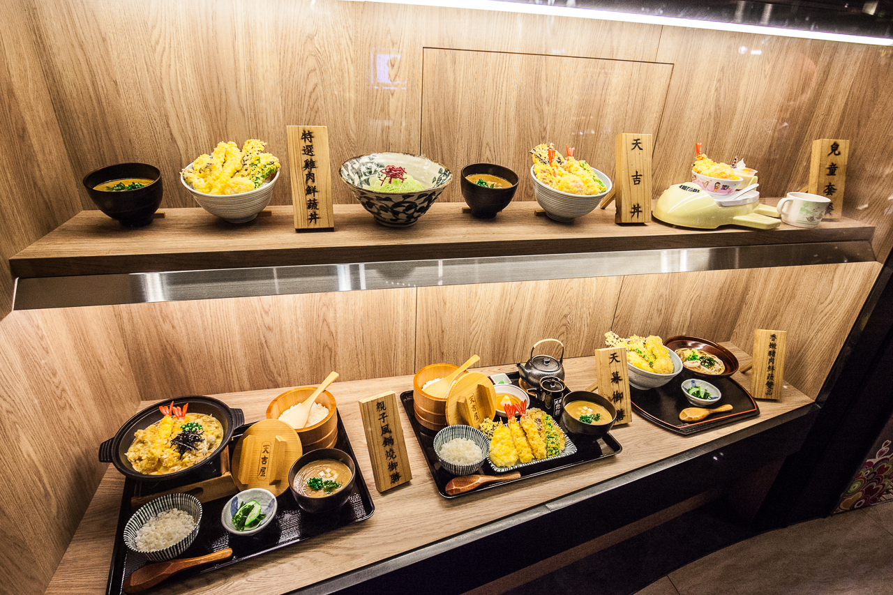 天吉屋的入口處在這裡,等候服務生帶位,旁邊的玻璃櫥成列了許多餐點的模型,看起來都好好吃,在日系連鎖店看模型選餐,幾乎都實物與模型相符,很少看到長得不一樣的^^