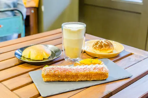 4ManoCaffé在咖啡這部分獲獎無數但其實我是為了他們家鬆餅而來的~~咖啡有著漂亮的拉花~味道不錯!咖啡上有一球香草冰淇淋~上面還有兩片薄荷葉增加美感!這一冷一熱一甜一苦的搭配實在好喝!!下層的盤子滿有重量的唷!拿起來拍照時明顯感受到!藍莓巧克力鬆餅~本身不愛吃太多鮮奶油~普通!招牌麻糬鬆餅超級深受大家的喜愛!鬆餅像是很多小水滴拼湊起來的形狀!鬆餅裡面包著麻糬!鬆餅上淋上蜂蜜讓人難以忘懷的美味阿!!!