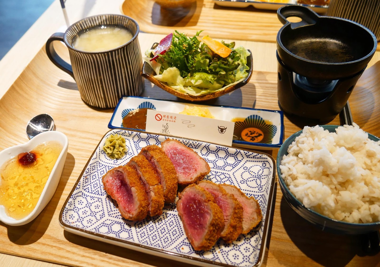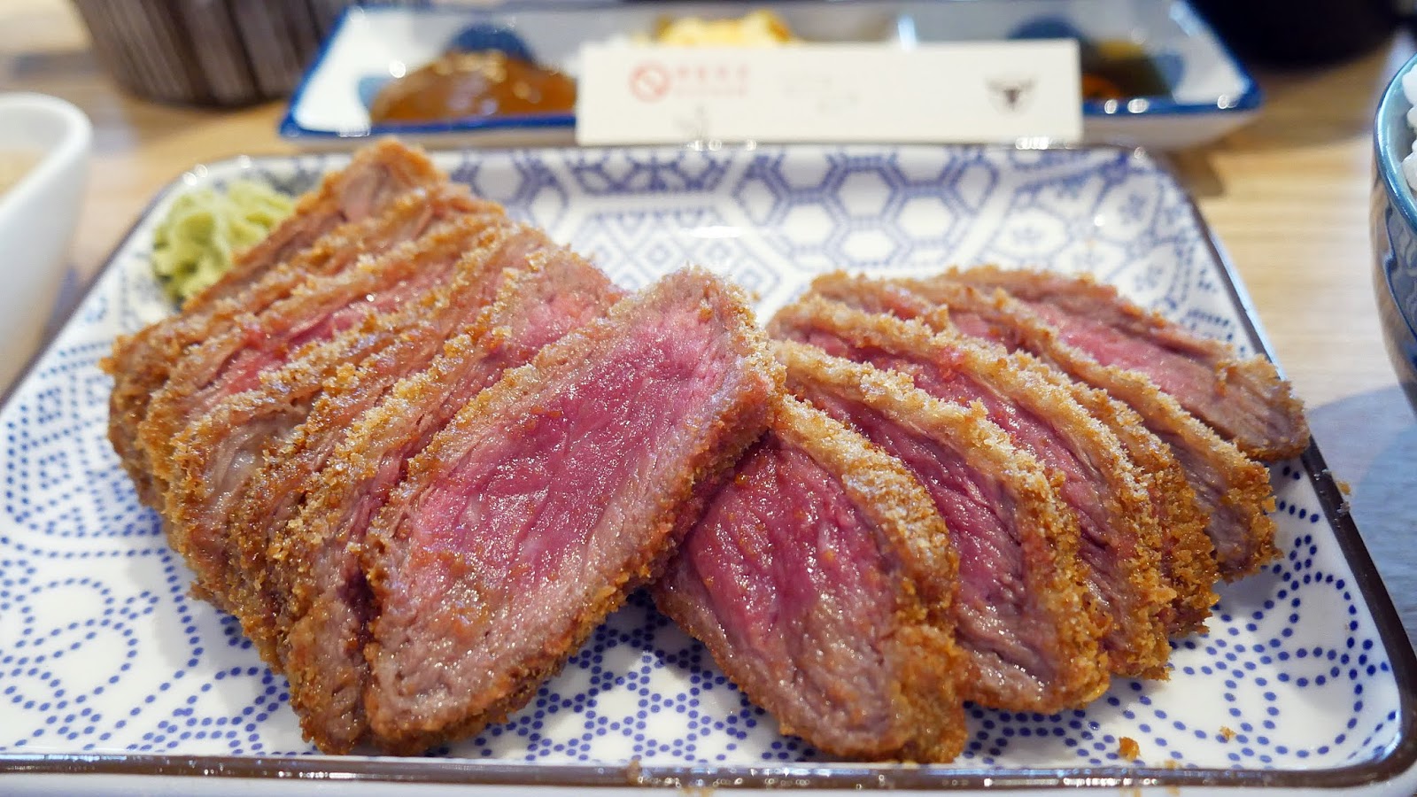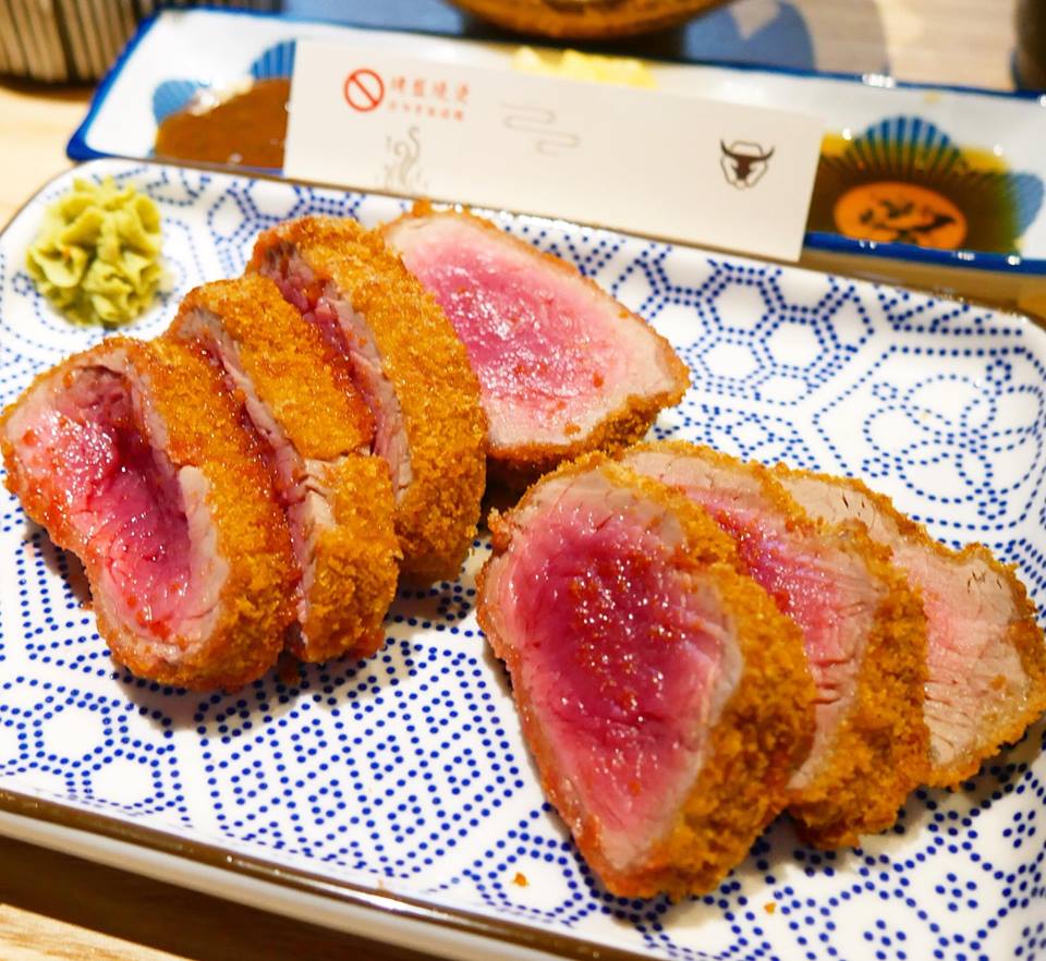 乍牛是以不同部位的牛排裹了麵包去炸到五分熟,然後再切片。