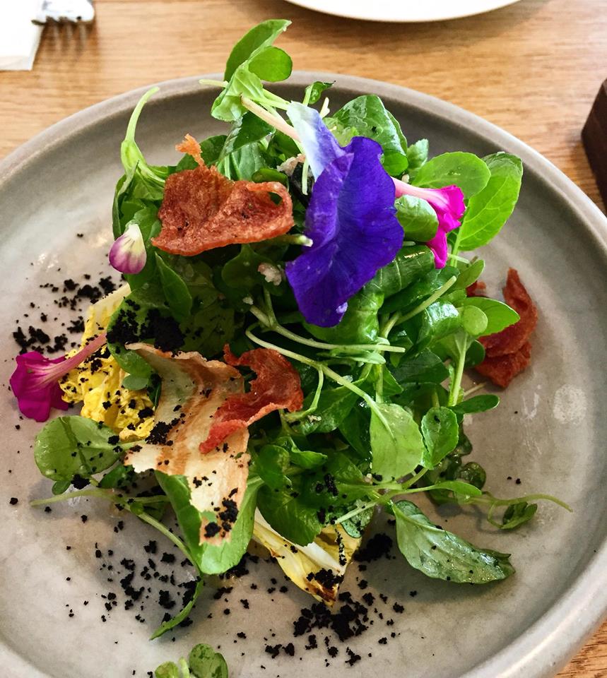 上面是一些生菜、還有可以食用的蝶豆花和另一種粉紅小花,