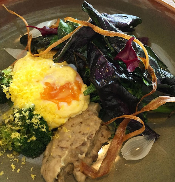 要把蛋稍微劃破,讓半熟蛋液流出來,跟蔬菜攪拌一下來吃。