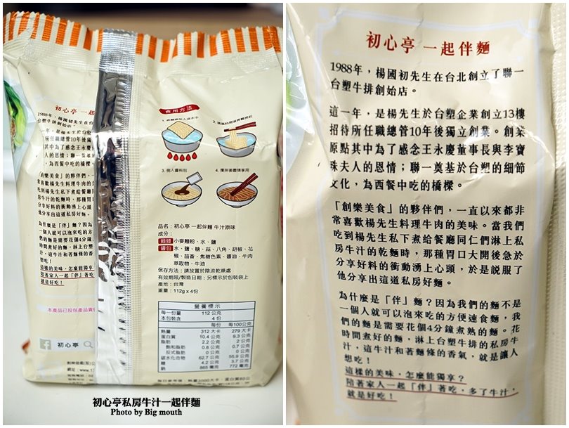 ▼包裝背面有寫到「初心亭」一起伴麵的由來,沒想到裡頭的重點牛汁正是聯一台塑牛排創始人楊國初先生當初煮給廳餐同仁的乾麵上頭淋的牛汁,現在在家裡就能輕鬆享用得到啦!而且用「伴」就是希望跟家人一起作伴吃乾麵,感覺更溫馨美味!