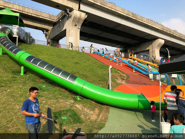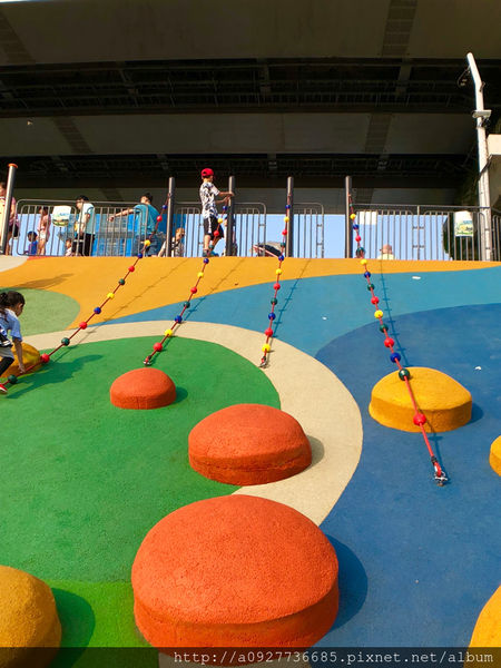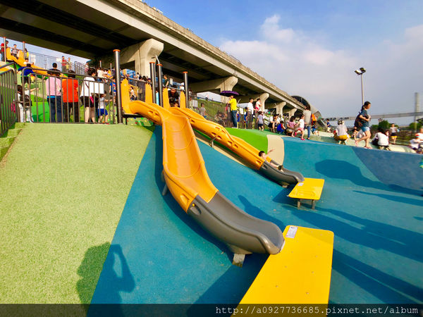 這裡有7米高的圓弧溜滑梯、滑石子碗公溜滑梯、彩虹溜滑梯、攀爬網、攀爬塊和立體浮球等多樣親子玩樂設施,不但具有挑戰性的遊具多、彩色繽紛,附近也可以騎騎單車跟野餐,滾媽就說超級適合全家大小或情侶一起來吧!!