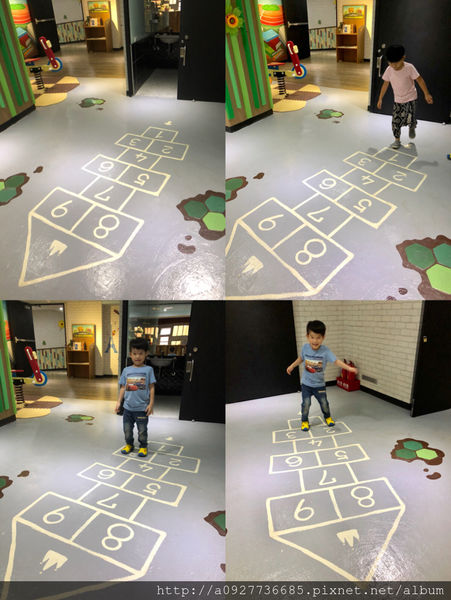 滾兒跟元寶看到地上的跳格子馬上就迫不及待跑去玩了,完全不想理媽媽😂