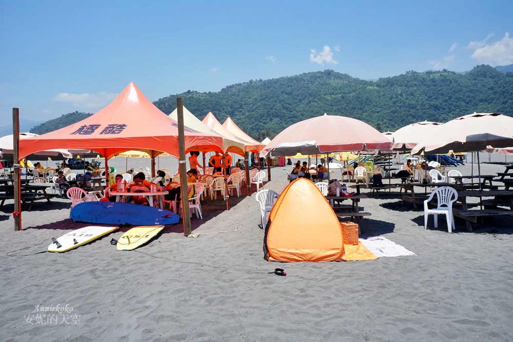 極酷衝浪在海灘上也有不少遮陽的座位,座椅非常舒適,我們還很三八的帶帳篷來玩,但這天實在太熱了,沒人想要躲到帳篷裡(笑),建議來衝浪可以多帶一些造型可愛的游泳圈,即使不會衝浪坐在海邊玩水也很消暑。