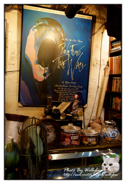 昏黃光線打在一堆舊書堆中,就算忽然冒出一張這樣的靈魂嘶吼海報卻也不覺得奇怪,仔細看店內還有賣些小點心,但實際上並沒有提供吃東西的地方。