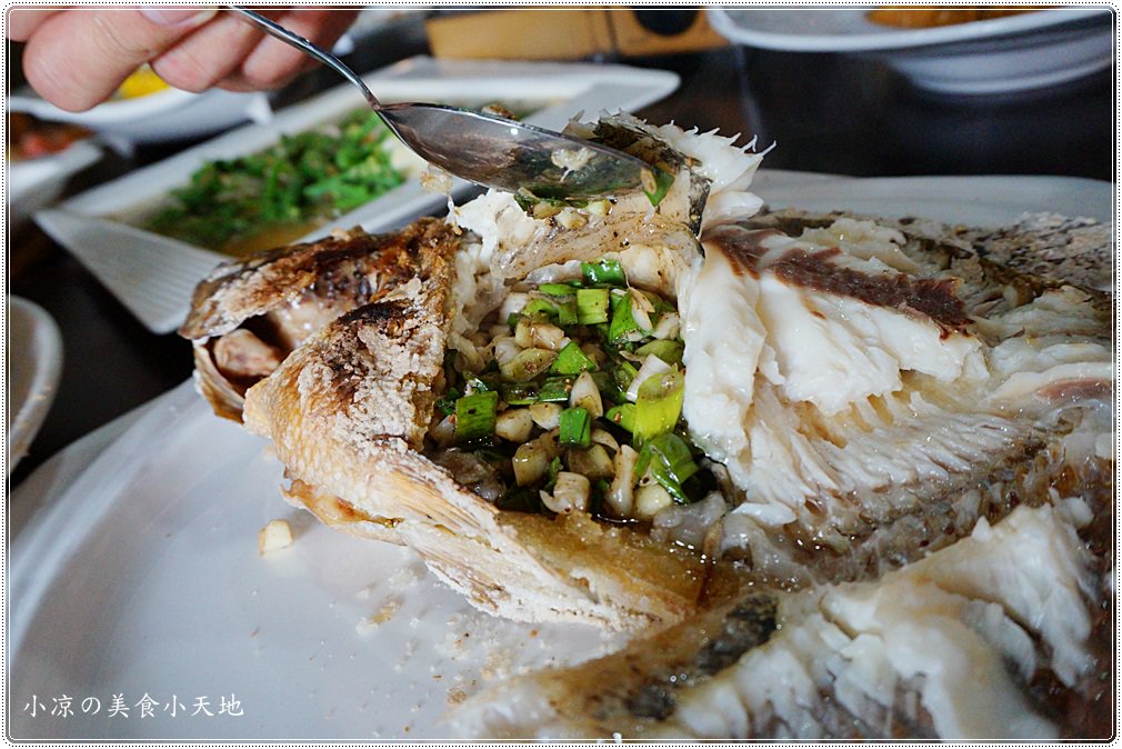 除了外層的大量粗鹽以外,魚肚內塞進蒜末、蔥末調味