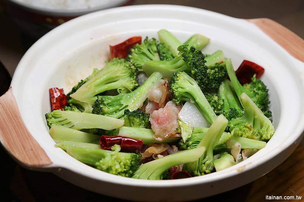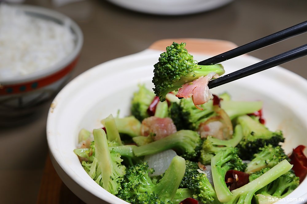 嚐一口綠花椰菜和臘肉,臘肉散出的特殊香氣和爽口的綠花椰菜搭起來就滿合的,微辣帶出食慾。