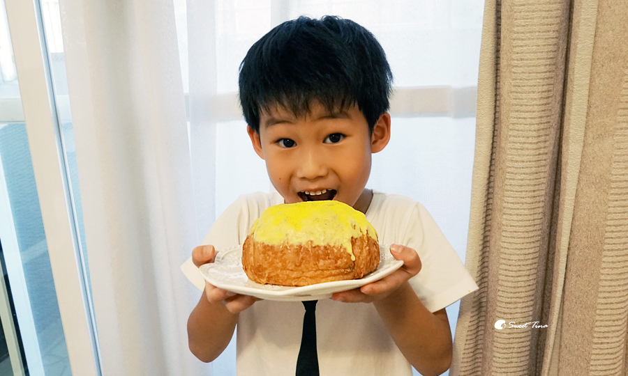 切下後岩漿(法式卡士達醬)真的流下來啦,乍看會以為法式卡士達醬是半固體的,其實是非常綿密且帶點水狀的口感喔,又香又細緻呢。
