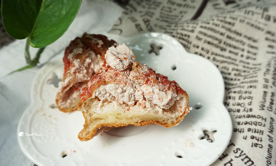 惡魔蛋糕捲 - 以巧克力蛋糕為麵包體,內餡除了有鬆軟的巧克力綿花糖,還吃得到草莓和巧克力豆喔,而且草莓的酸化解了巧克力的甜,是非常契合的搭配呢。