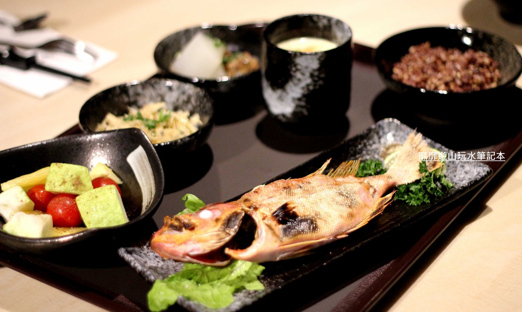 季節限定的時尚鮮魚定食價格要以當天店內的時價公告為主,定食內會附上五穀飯、兩樣小菜、茶碗蒸、味噌鮮魚湯、十二果沙拉~