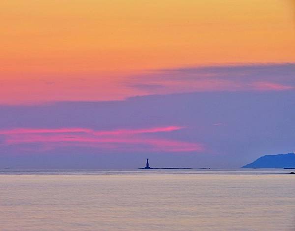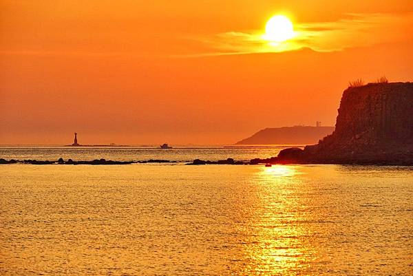 鏡頭拉遠一點欣賞,遠方的小漁船和海上的指標塔柱也能成為畫面的主角,