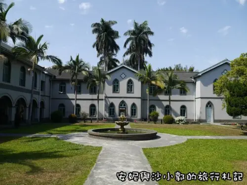 台南神學院灰白色建築搭配藍綠色門窗,讓人很有記憶點,