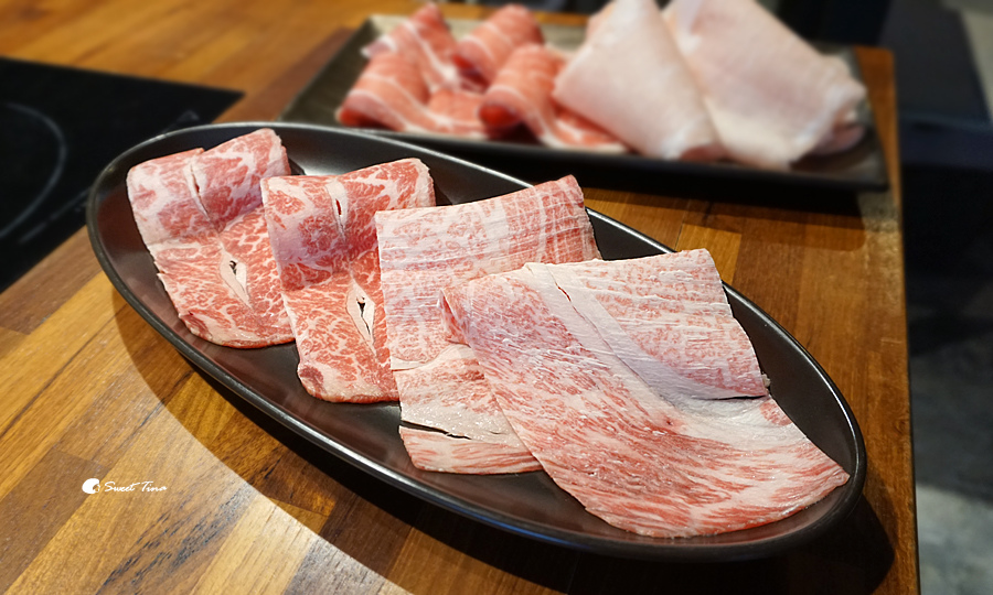 特選豬肉 - 左邊為伊比利梅花豬 80g(約四片)、右邊為台灣黑毛松版豬 60g(約四片),豬肉吃起來帶點脆帶點Q,鮮美無腥羶味的口感,完全不輸牛肉呢。