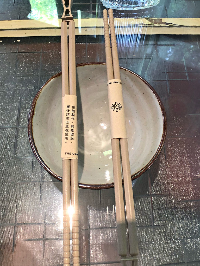 ▲快子並非一般筷子,是用稻殼製作而成的環保筷,可以再三使用,如果不用的話請不要亂丟,可以埋在土中,大概一兩年就可以自行分解了