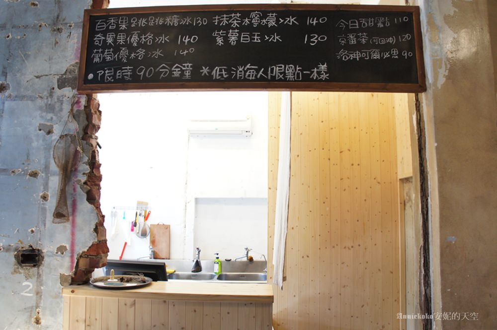 點餐結帳的櫃台也相當具有特色,裸露的磚塊宛如傾圮的建築,而料理台、結帳區、點餐區通通置身裡面,印象中是個清新脫俗的女生為我們點餐以及介紹餐點,牆面上的冰品是去年的項目,今年好像又增加不少品項,大家可以到粉專瞧瞧。