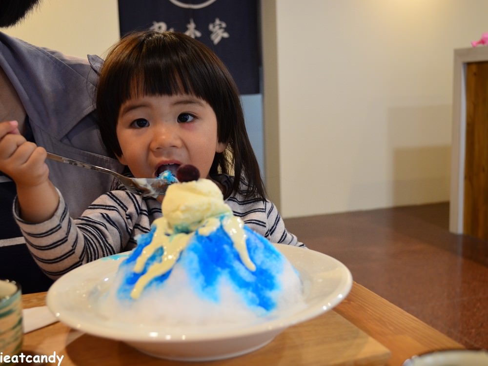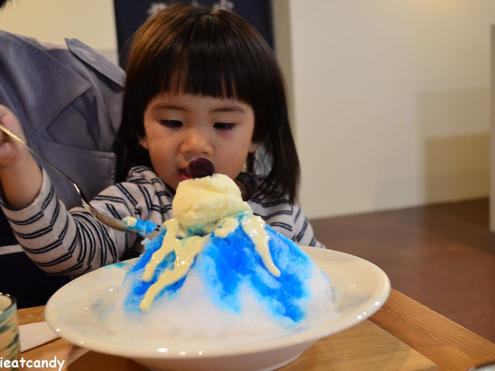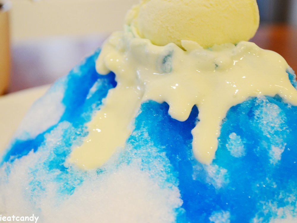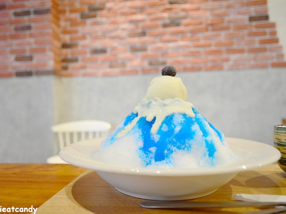 利用藍柑橘糖漿呈現的水藍色光澤,上面淋上店家自製優格、香草冰淇淋,展現了富士山的視覺感。優格吃起來不會太酸、太甜,帶點優格風味而已,不會太濃郁;第一次吃到藍柑橘口味,個人挺喜歡,甜但吃起來很清爽~冰淇淋是店家自製的,風味也挺濃郁,最上面那一顆是莓果,帶點果酸味。