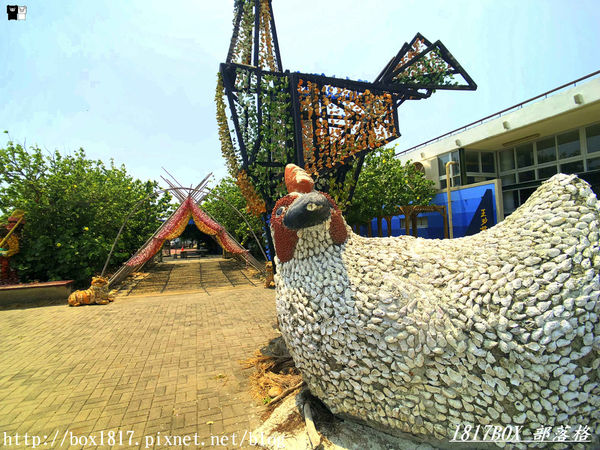 王功蚵藝協會用上千個蚵殼做成高30公尺的大型福氣雞裝置藝術,芳苑是全國重要的雞蛋產地,也希望用蚵藝行銷在地產業。