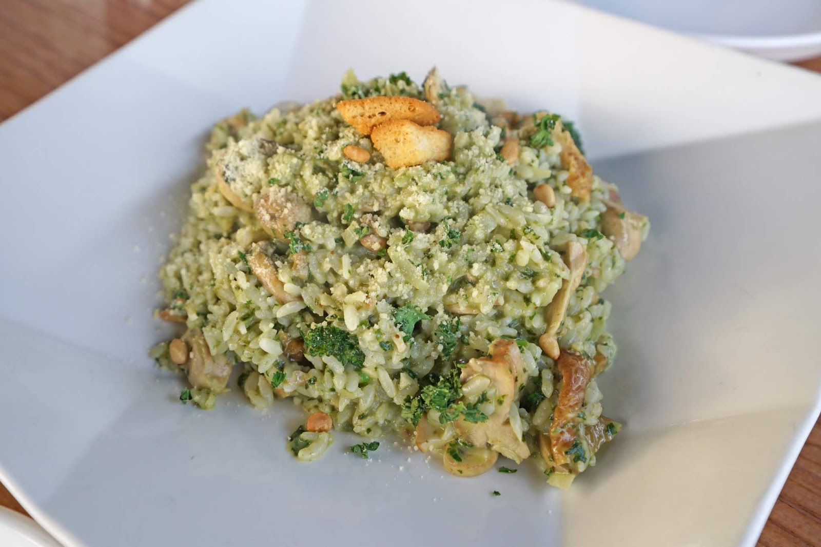 青醬雞肉燉飯的青醬是用新鮮香草去打的,味道自然清香,沒有過重的調味,吃起來很清爽,雞腿肉雖然沒有想像的大塊,但烤過的雞腿肉夾雜在青醬燉飯裡,味道很協調。
