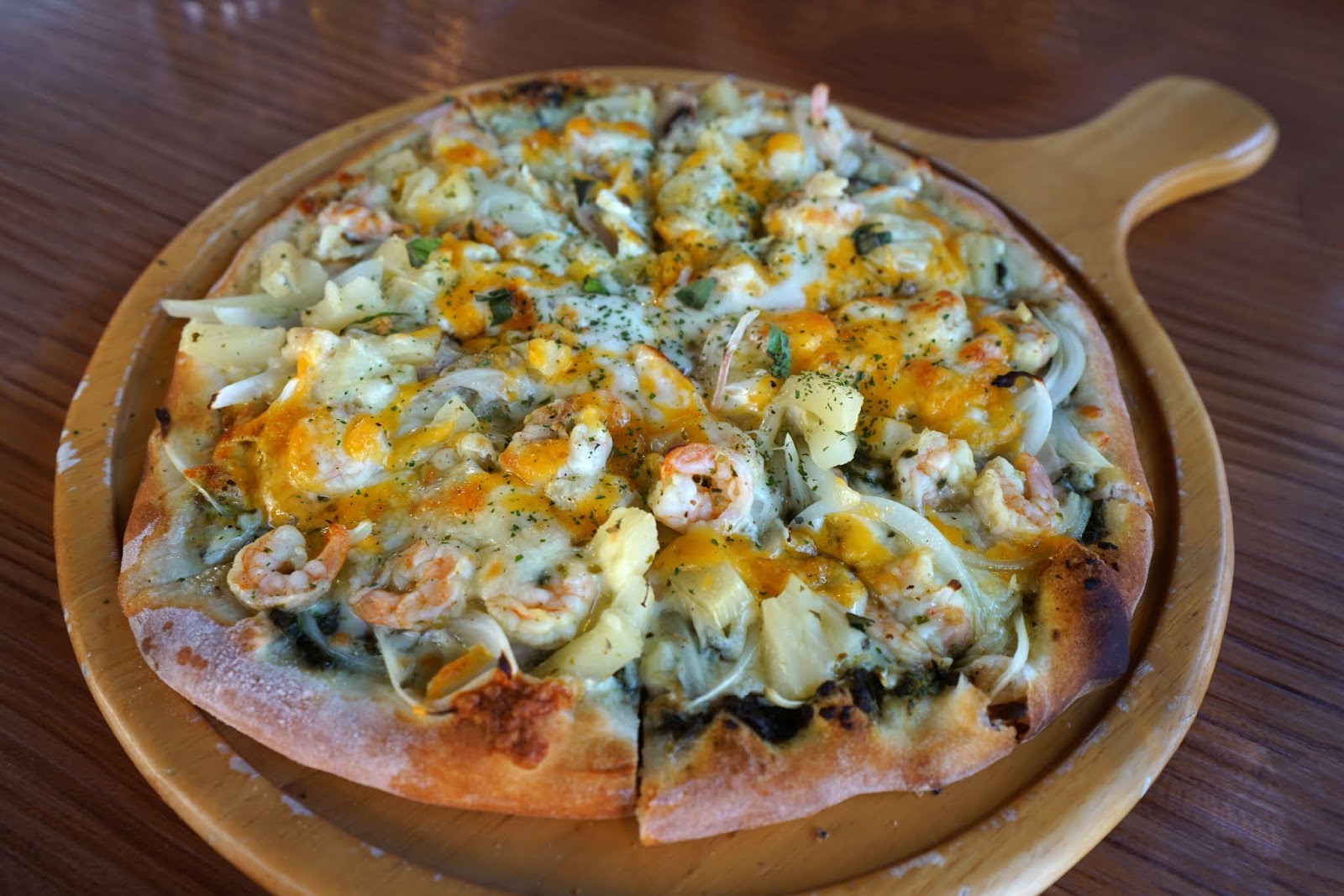 青醬鳳梨蝦仁披薩,味道很清淡,原本以為現在是鳳梨產季,會使用新鮮鳳梨片去做,但讓我有些小失望,用得是罐頭鳳梨,少了鳳梨的酸香氣味,吃起來味道很平庸。