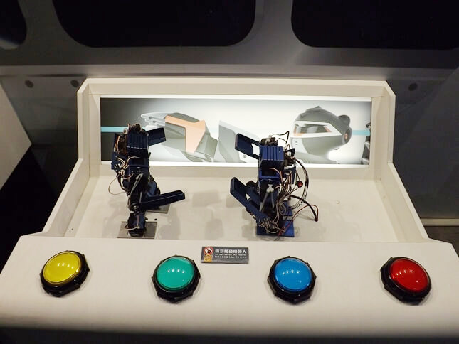 機器人擂台大概是祥儀機器人夢工廠裡面,數一數二的熱門遊樂設施,簡單來說就是有一個小型雷台,然後有4到6台機器人,每個人選一台屬於自己的,透過遙控器開始與競爭者打擂台賽,上圖這個練習機就是讓遊客們熟悉如何操作的設施,例如蹲下、站起來、 左勾拳、右勾拳、旋轉、前進或後退走動等,各式各樣的動作練習好了之後再上擂台開始比賽會比較有勝算。