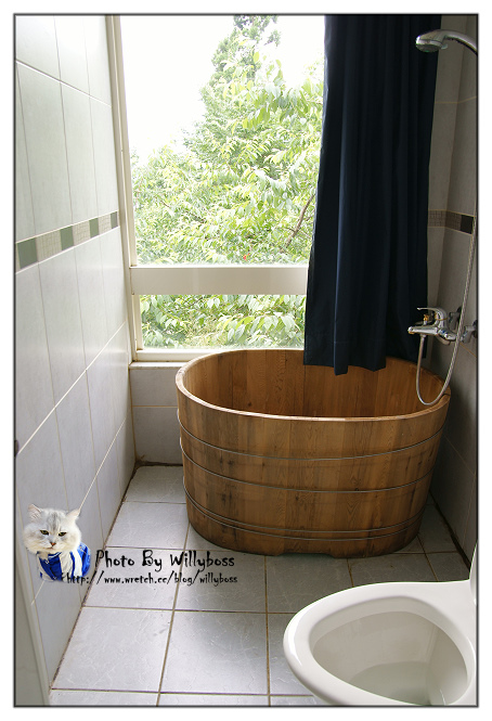 浴室擺了個木製泡澡桶,拉開窗簾就可以邊泡澡邊欣賞風景,怕被看光光的就拉上吧XD!