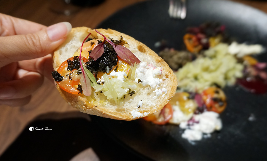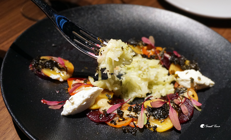 這盤沙拉不僅很美運用的食材也很精緻,是一般餐廳較少見的搭配,裡頭有甜菜根、牛血草、甘藍,中間則是略帶點鹹味的青芒果,附上了橄欖醬、辣根醬、起司醬,每口都有不同層次不同的味蕾享受,相當特別的一道沙拉呢。
