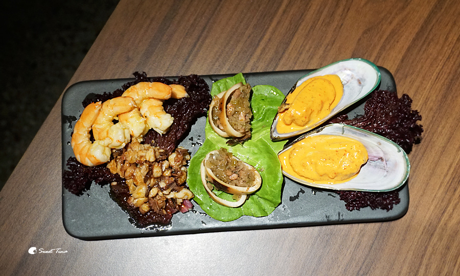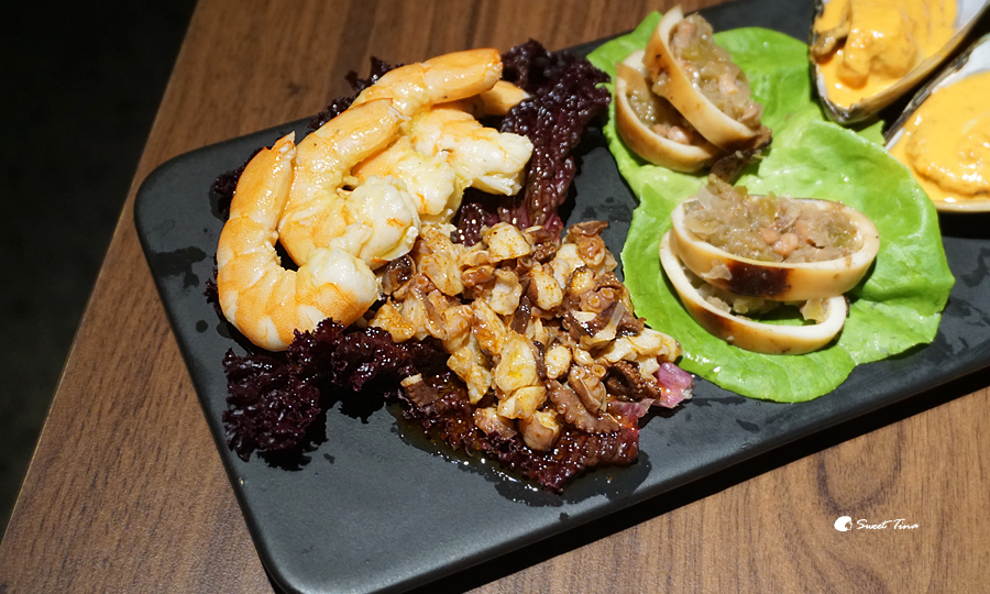 綜合海鮮冷盤(小) - 裡面有酒蝦、紅椒粉漬章魚足、洋蔥墨魚、霹靂醬漬淡菜,每樣海鮮口感都相當突出,搭配著餐前酒超對味,夏天吃起來也格外的清爽。