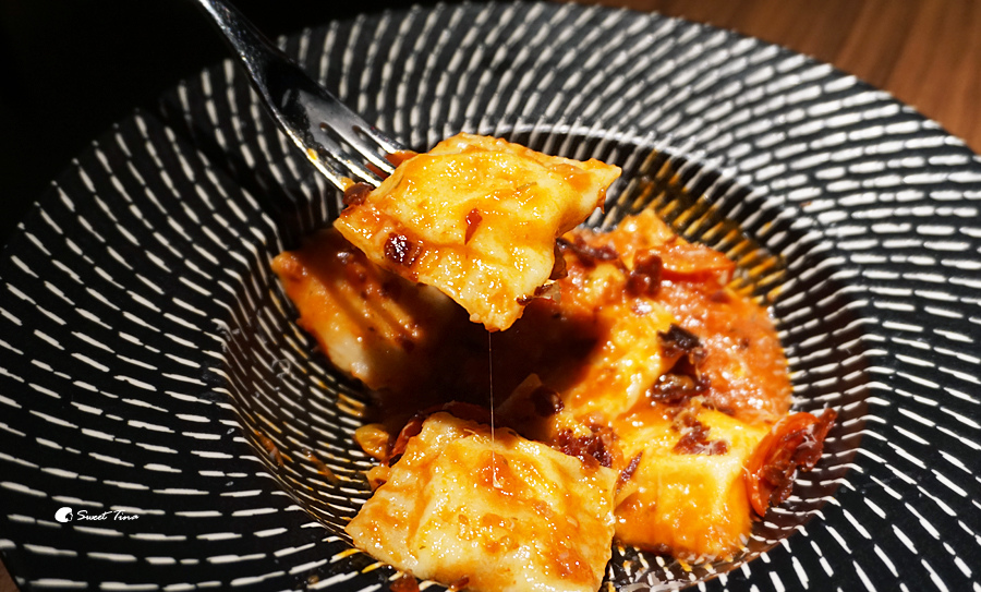 伊比利肉乾南瓜乳酪義大利餃 - 南瓜餃搭配了蕃茄、乳酪醬再灑上伊比利肉乾,讓QQ的麵糰咀嚼起來多了些肉乾的香氣,第一次品嚐到這次的搭配,很喜歡。