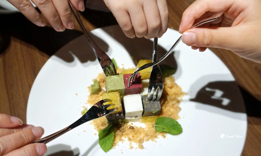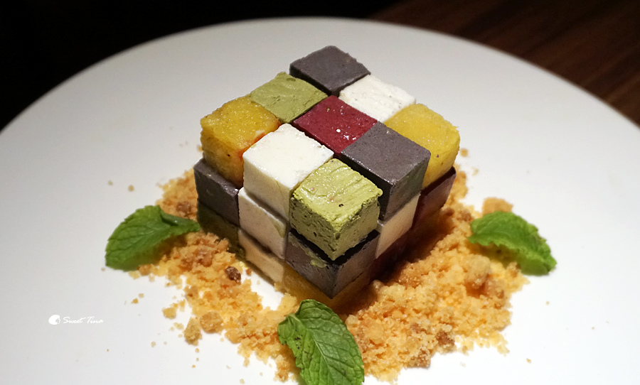 魔術方塊慕斯 - 我覺得這份甜點實在太有創意也太用心了,吸晴度真的破錶了,而且最棒的是透過每個方塊還可以品嚐到不同口感的甜點,每口都是驚喜。