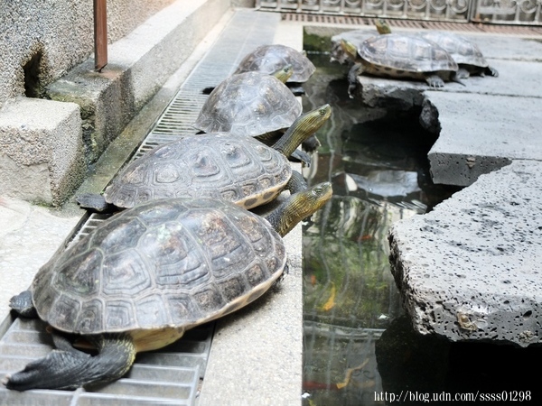 ▲視線轉往一旁有個小生態池,池子裡養著好多隻烏龜,算了一下至少有六隻