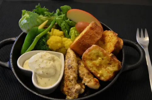 可是,這餐點的炸雞吃起來格外引我注目,它的外皮酥脆,吃起來也不會很乾