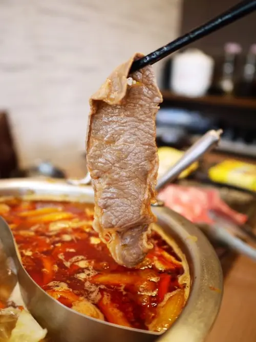 湯底上有一層通紅辣油,辣度微辛不嗆、有些偏鹹的口味,更加速食材風味的附著力。