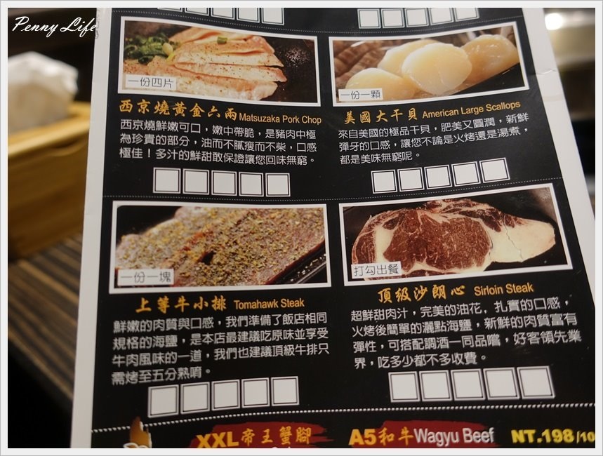 有上等的牛小排、沙朗、霸王蝦、大干貝等等可選擇,