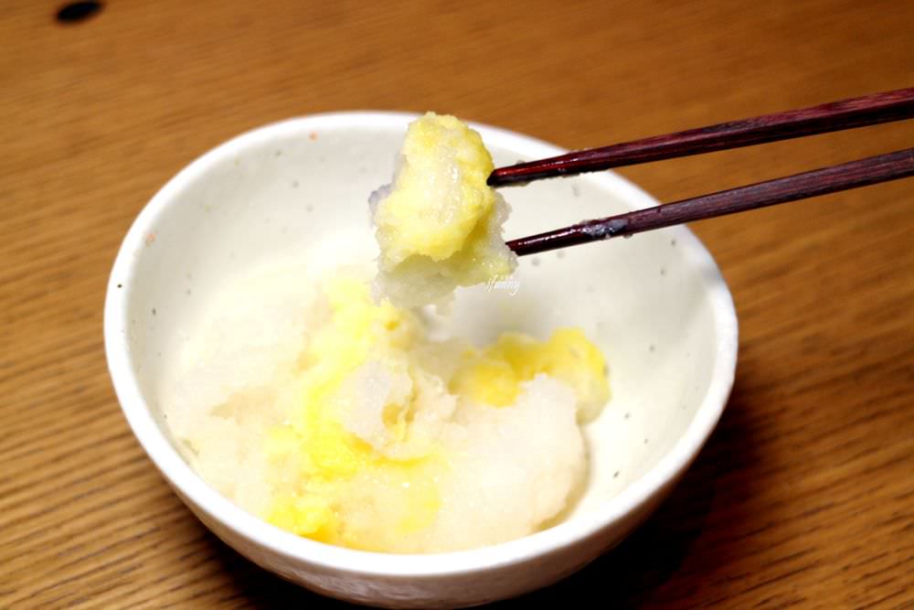 先將鳥蛋與蘿蔔泥拌開來,裡頭還有店家自製的高湯醋,有去除口中食物異味,具有轉化味蕾的作用。