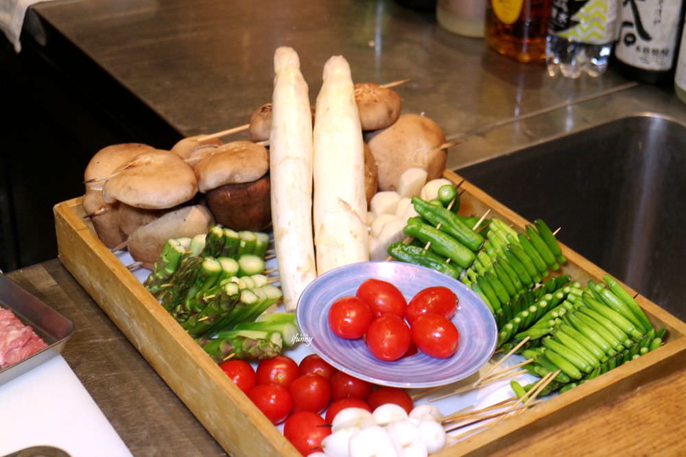 東京田町 鳥心備有許多特別的蔬菜燒烤,像是中間很長一隻的是要價不斐的白蘆筍,另外也有珍珠洋蔥及日本的時時豆等等。