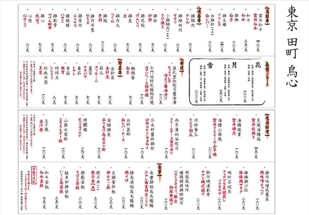 東京田町 鳥心菜單主要以套餐為主,價格有$1200、1500及2000三種價位。