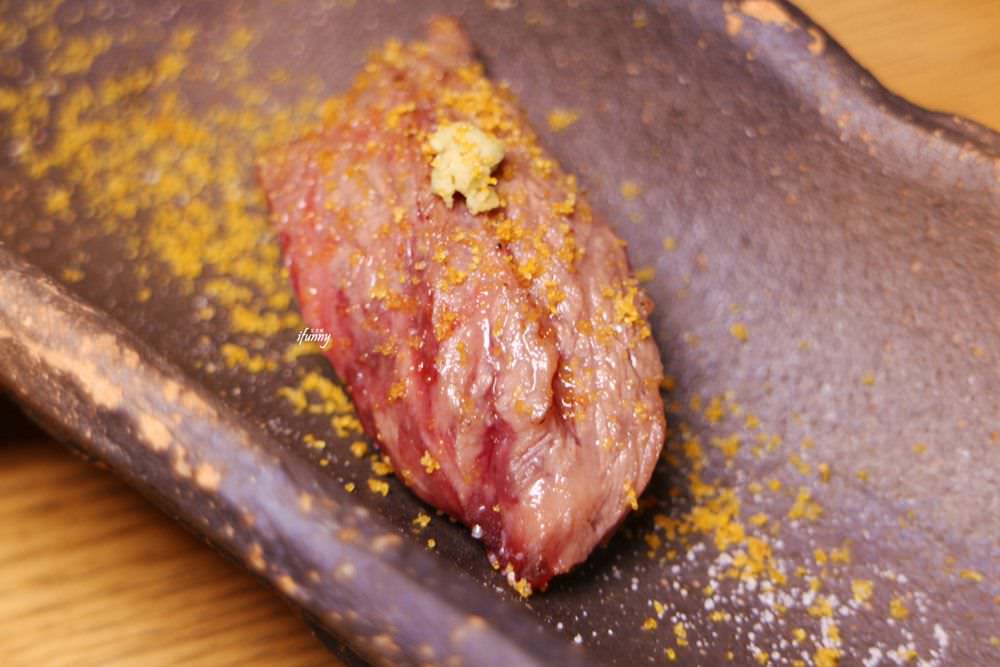 在和牛握壽司上大器地灑上烏魚子末,一近鼻就是烏魚子的香氣。烤好的和牛還散發出自身豐富油脂的光亮。