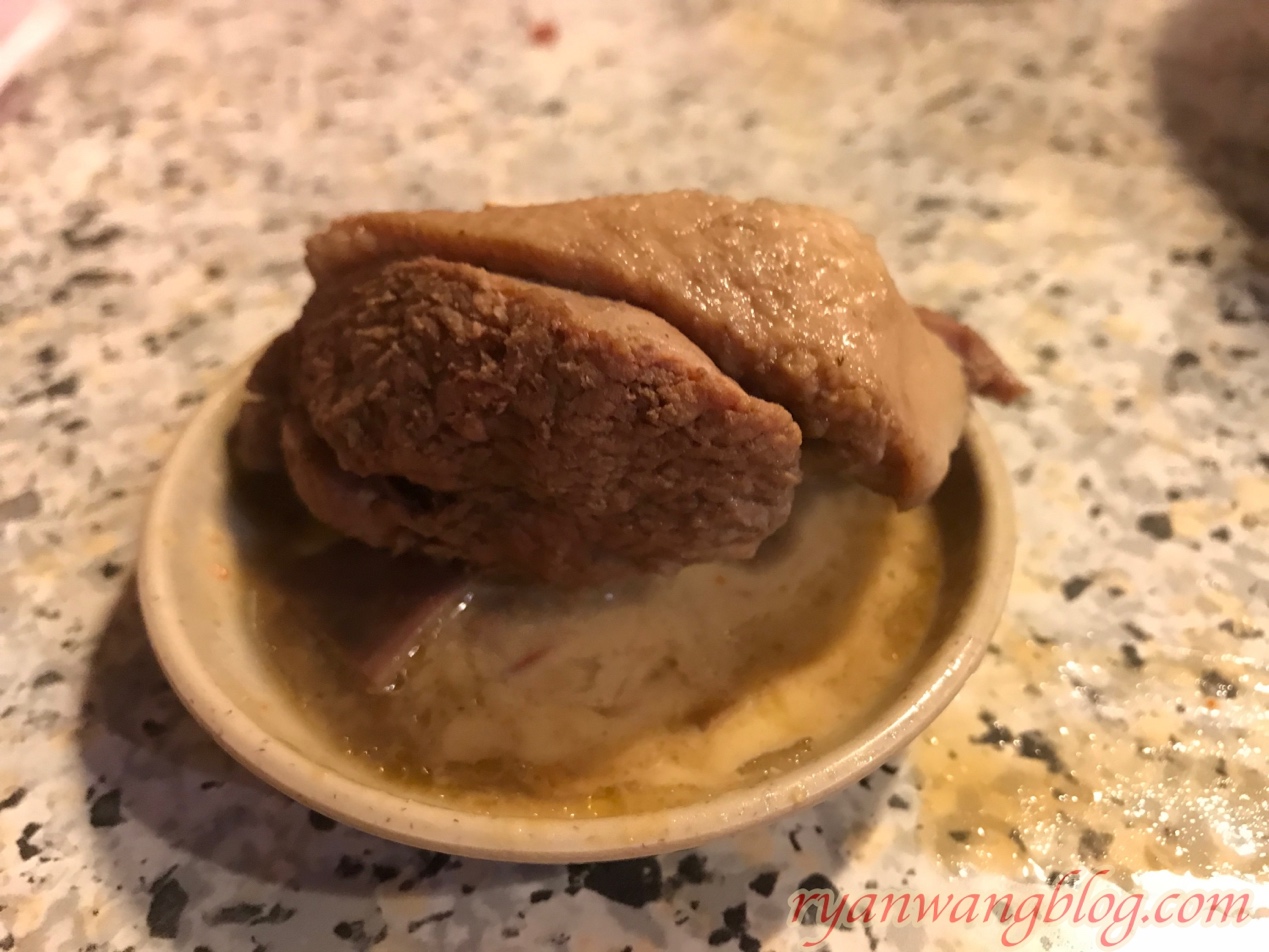 然後則是心腱肝的內臟組合,包含鴨心、鴨腱和鴨肝,其實一間薑母鴨的食材究竟夠不夠新鮮?從內臟就知道,這裡的內臟在熬煮過後,一入口,不僅有濃濃的薑母鴨鍋的麻油香氣,而且就算不沾醬,也一樣連一點腥味也沒有,讓一些喜歡吃內臟、又怕腥味的朋友們,可以不用再憋氣吞下肚了~