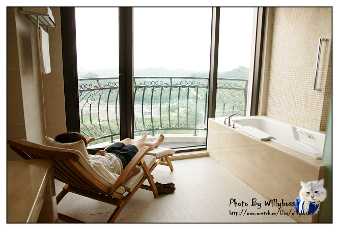 浴室裡頭有大面的落地窗,只可惜看出去的風景是大停車場XD。