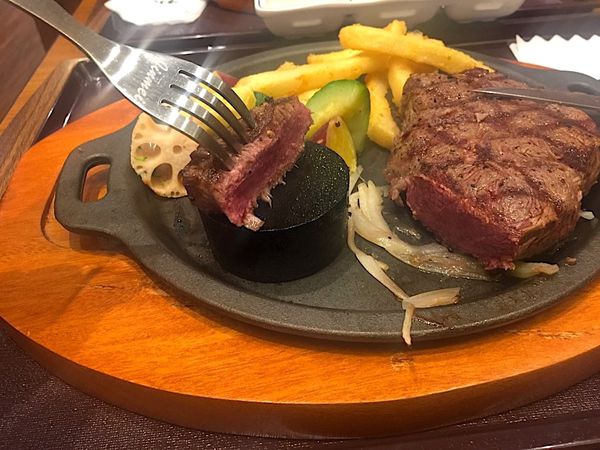 店家給的牛排大約是煎到5分熟的狀況,但旁邊的黑色圓石其實就是個加熱石,可以隨自己喜好再上面煎肉,