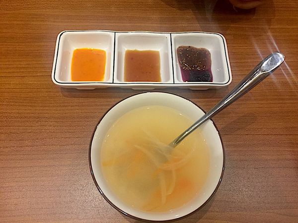 湯就是有洋蔥與紅蘿蔔的清湯,但不知道是不是客人太多來不及煮,紅蘿蔔味有點重,吃起來也沒有煮很久、軟嫩的感覺,但湯頭滿好喝的,