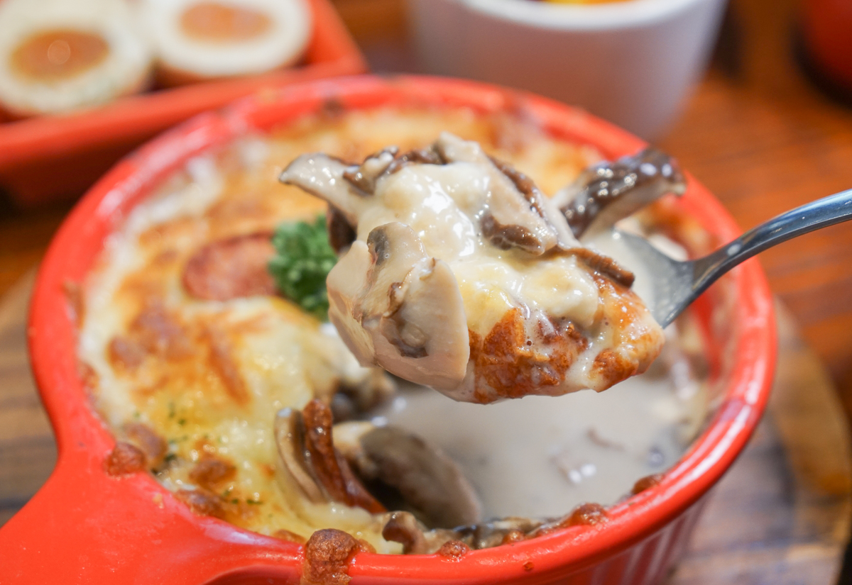 這份焗烤盅裡面塞了很多清爽的菇類,