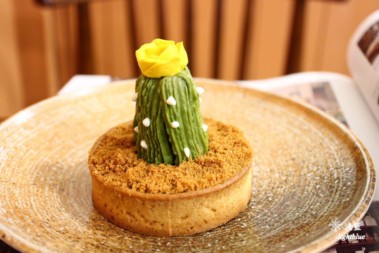 仙人掌部份以抹茶馬茲卡彭起司、抹茶手指餅乾製作,抹茶塔則是抹茶杏仁餡。