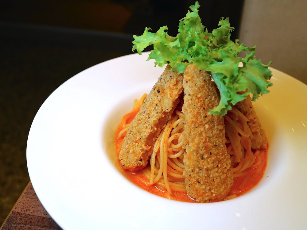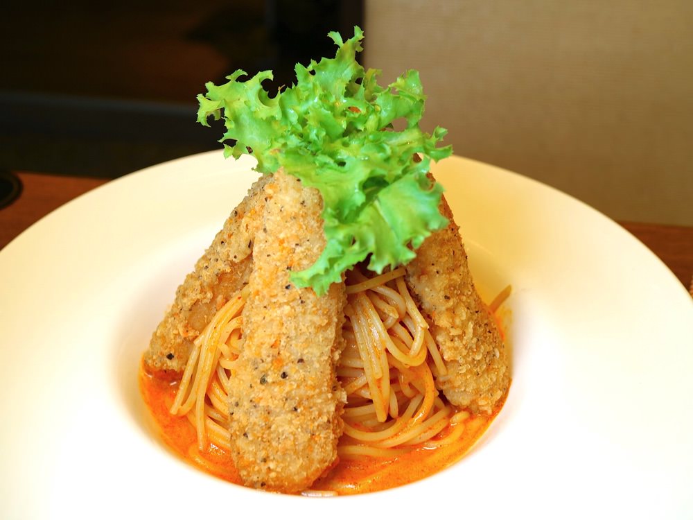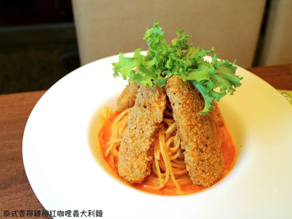 泰式香檸雞柳紅咖哩 義大利麵,整盤義大利麵上方有著一整圈的檸檬雞柳條。